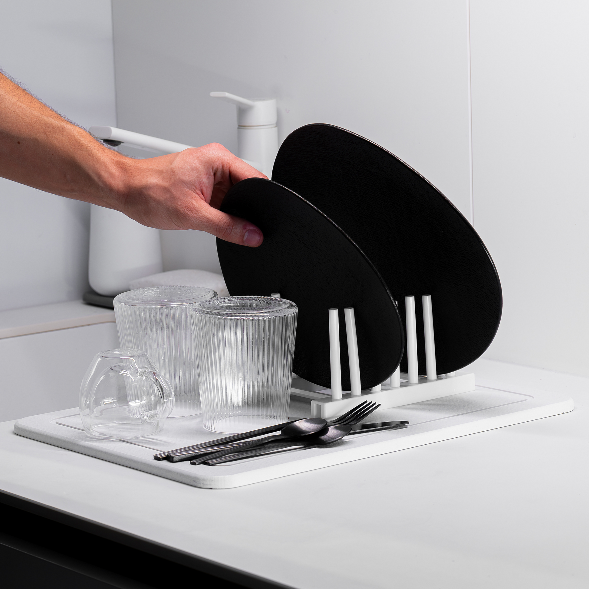 DryDish este soluția ideală pentru organizarea bucătăriei tale, un suport din diatomit 100% natural ce combină utilitatea cu un design modern. Organizatorul inclus este conceput să susțină până la 6 farfurii mari, oferind în același timp spațiu suplimentar pentru pahare și tacâmuri, pentru o bucătărie ordonată și elegantă.